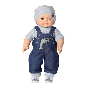 В комплект одежды входит: джинсовый полукомбинезон с вязаными резинкой манжетами. На нагрудник настрочена аппликация «Дельфин». Футболка, вязанная гладью, с короткими рукавами, воротником-стойкой вязаным резинкой, с застёжкой сзади на контактную ленту. Трикотажные носочки, вязаная гладью шапочка, с отворотом по низу и отделочной деталью из джинса с настроченной поверх пуговкой на отвороте спереди сбоку. Обувь - кроссовки с ручной росписью.