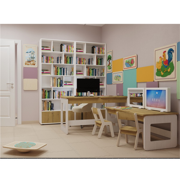 Готовое решение по оснащению кабинета логопеда в ДОУ. Содержит всё необходимое современное оборудование для эффективной работы детского специалиста: стол логопеда с компьютером, рабочий стол для детей, интерактивную панель с профильным ПО для логопедов «Звукоречье», дидактическую панель «Азбука речи», набор корпусной и мягкой мебели, безопасные зеркала, нейротренажеры, методические материалы и пособия.
