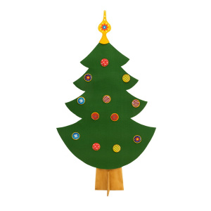 Описание: Чехол елка сделан из ковролина зеленого цвета. 4 яруса веток. Сугроб (7 деталей) из белого фетра, 10 снежинок с липучкой сзади, 12 шаров из желтого фетра с наклейками с липучкой сзади, нарядная верхушка из желтого фетра.