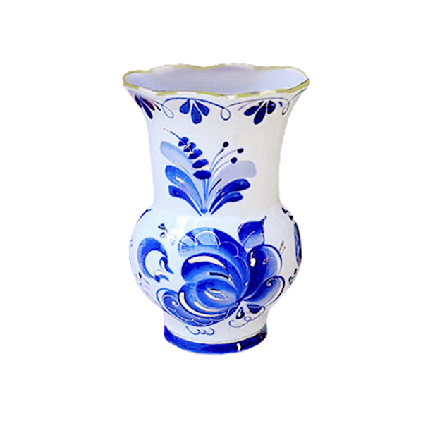 - Вазу, расписанную гжелью. Фарфоровая ваза в форме цветка колокольчика украшена узнаваемыми безо-голубыми флористическими узорами с тонкими золотыми элементами.