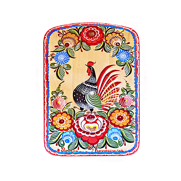 - Разделочную доску с городецкой росписью. На прямоугольную доску с закругленными краями нанесены традиционные для городецкой росписи узоры - пышные цветы, яркие птички, листики и завитушки сочных оттенков. Доска выполнена из дерева, ее размер - 24х15х1,5 см.