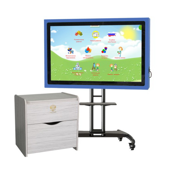 - Уникальная сенсорная панель 43" на мобильной стойке: комплекс можно установить на столе, монтировать на стену или использовать на мобильной стойке