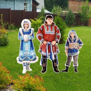 Композиция уличных фигур "Семья хантов" состоит из трёх отдельностоящих фигур: мужчины, женщины и ребенка. Они выполнена из ПВХ с нанесением полноцветного рисунка, покрытого защитной пленкой.