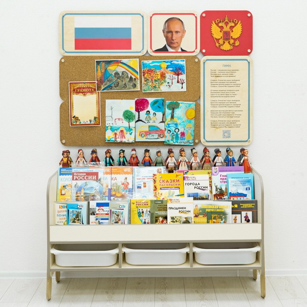 Уголок по патриотическому воспитанию для группы детского сада. Содержит основную символику РФ, панели для размещения работ воспитанников, книги по истории России, ВОВ, русские народные сказки и песни, книги на тему семьи и семейных ценностей, раскраски с тематическими иллюстрациями, настольные игры на тему патриотического воспитания. Соответствует требованиям ФГОС 3.