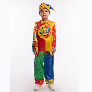 Карнавальный костюм Петрушки для мальчика на Новый год и другие праздники. В комплекте рубашка, брюки, колпак, воротник. Нашивка из фетра в виде солнца, разноцветный принт на сатине, тесьма в виде флажков по низу и рукавам рубашки.