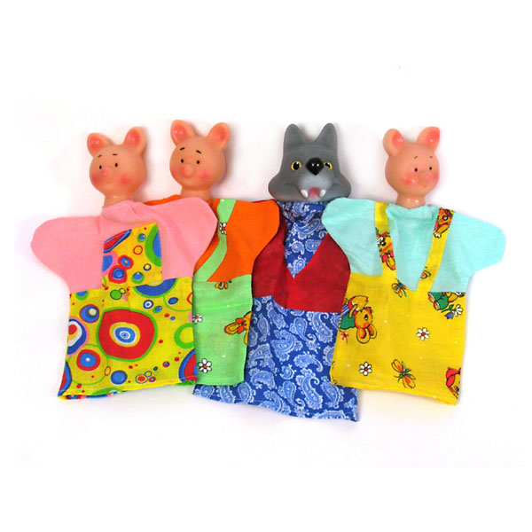 Непосредственно перчатки, выполняющие роль одежды героев, у всех разной расцветки. Кукольный театр "Три поросенка" упакован в полиэтиленовый пакет с картонной полосой. В комплекте: 3 поросенка, волк, сценарий.