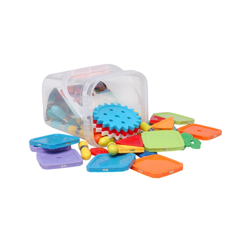 Состоит из: 51 детали (25 шт соединительных деталей с магнитнами, 3 шт большие шестеренки, 8 шт квадратных пластин, 6 шт треугольных пластин, 3 шт шайбы, 1 шт рукоятка, 5шт дополнительные элементы с изображением цифр, фруктов и т.д.).